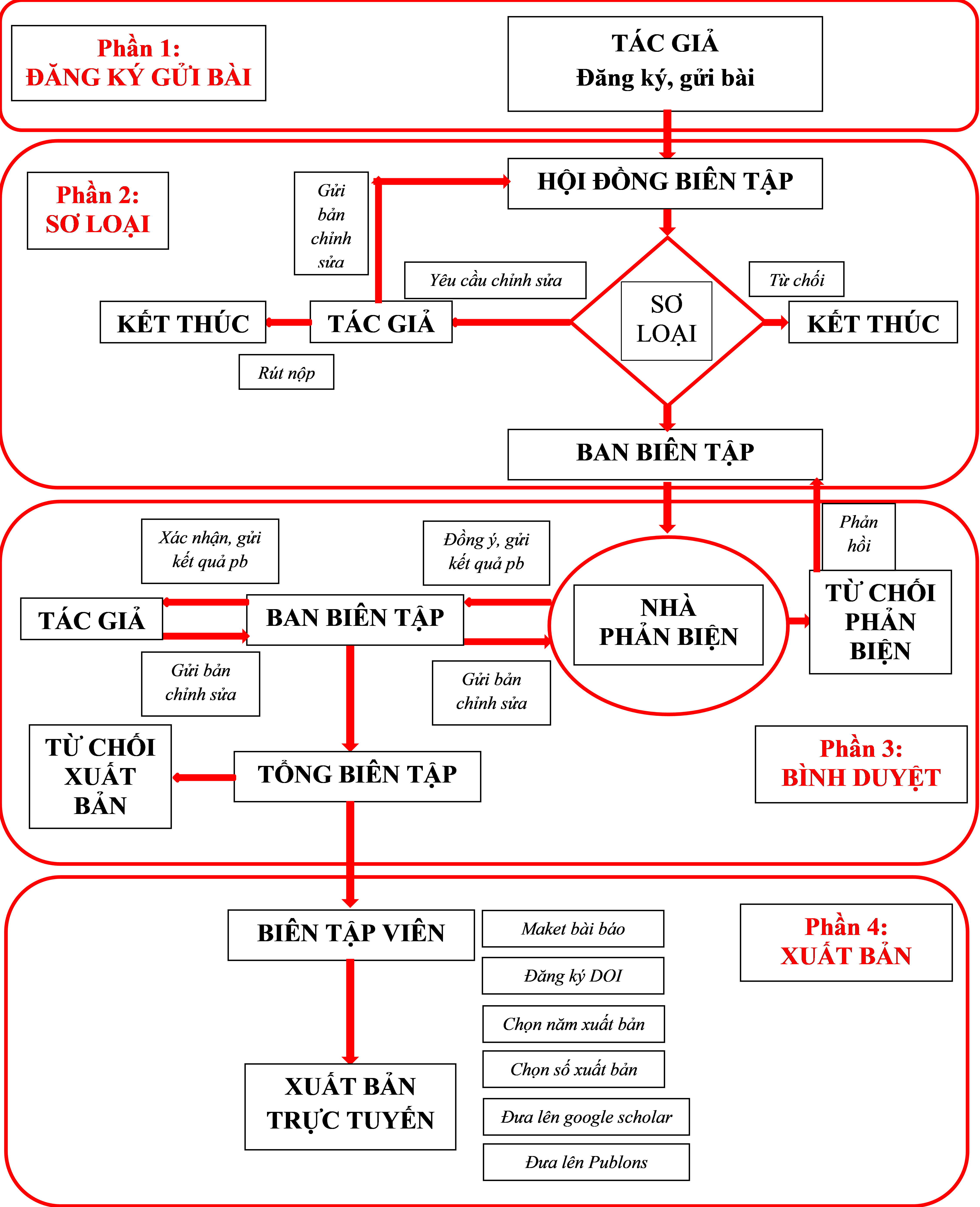 Lưu đồ thể hiện trình tự các bước trong quy trình bình duyệt, biên tập, xuất bản một bài báo được thể hiện trong hình dưới dây. Cụ thể như sau: